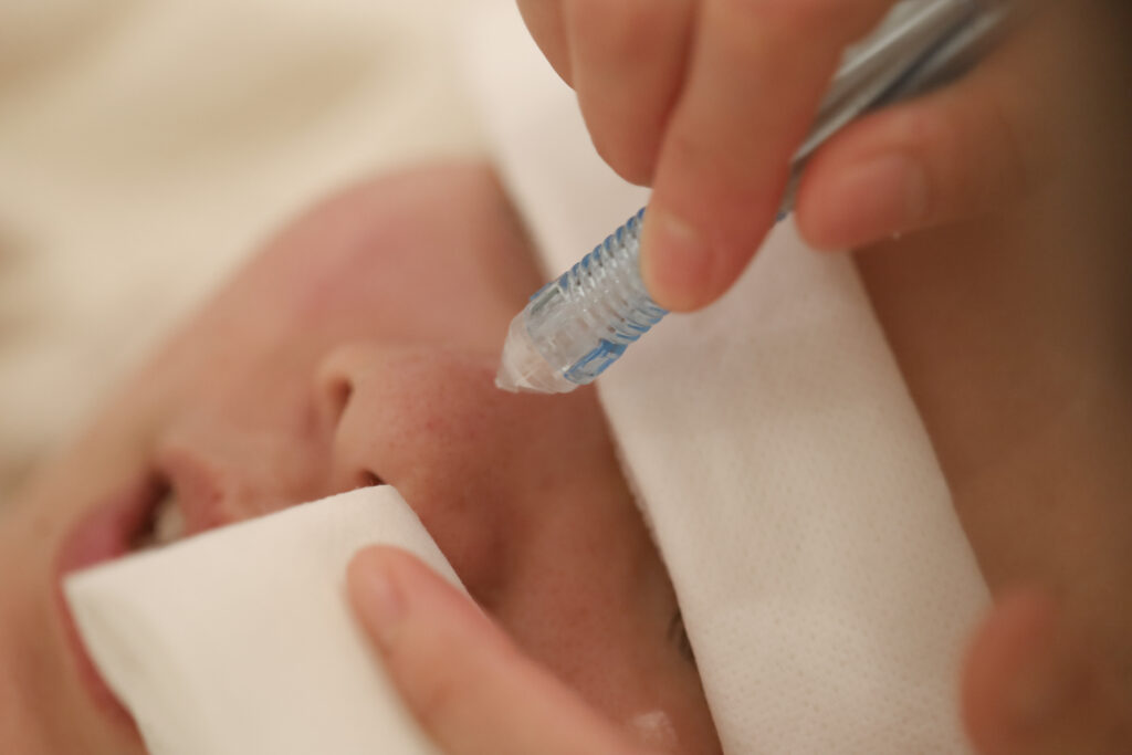 使用院內獨家「賦活精萃油」進行油洗臉,先將角質軟化、毛孔打開,並深入毛孔溶解髒污,溫和的讓粉刺慢慢浮出。