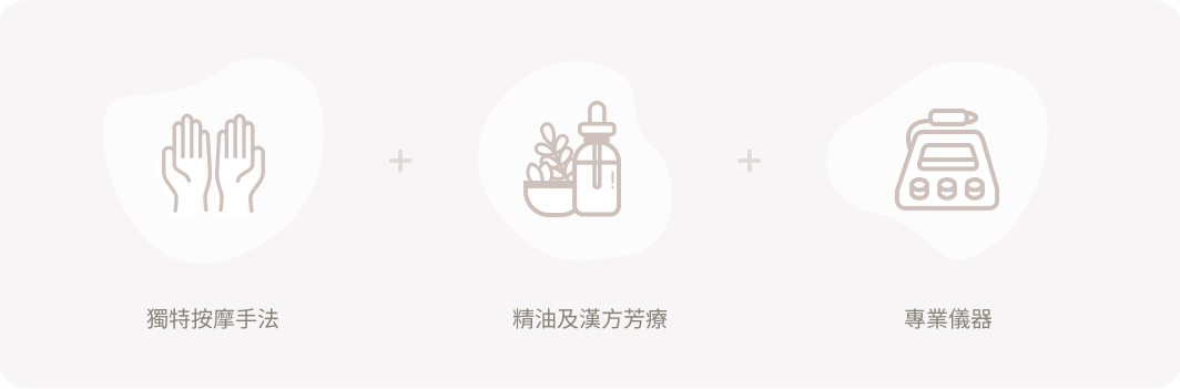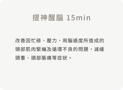 透過舒壓的背部經絡按摩手法結合熱能儀器,並搭配專業精油產品,將緊繃的肌肉神經放鬆,達到疏通經絡、促進血液循環、改善睡眠品質。藉由獨特的按摩及刮痧手法,疏通眼睛周圍穴道,改善眼周過度緊繃的肌肉,並增進血液循環,達到改善眼睛疲勞問題。通過按摩刺激頭部肌肉、舒緩肌肉緊繃症狀,促進皮下組織血液循環與肌膚細胞活化性。