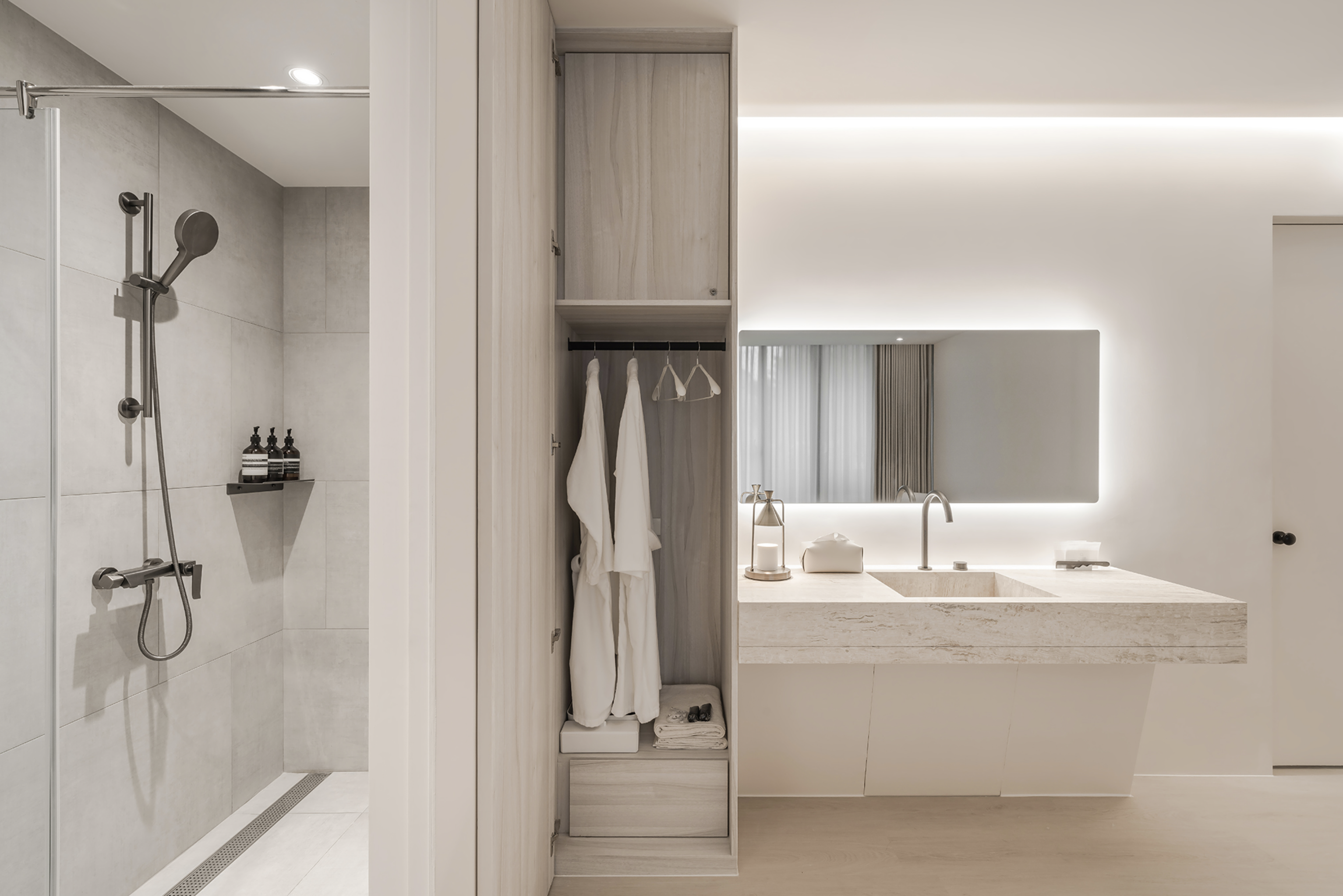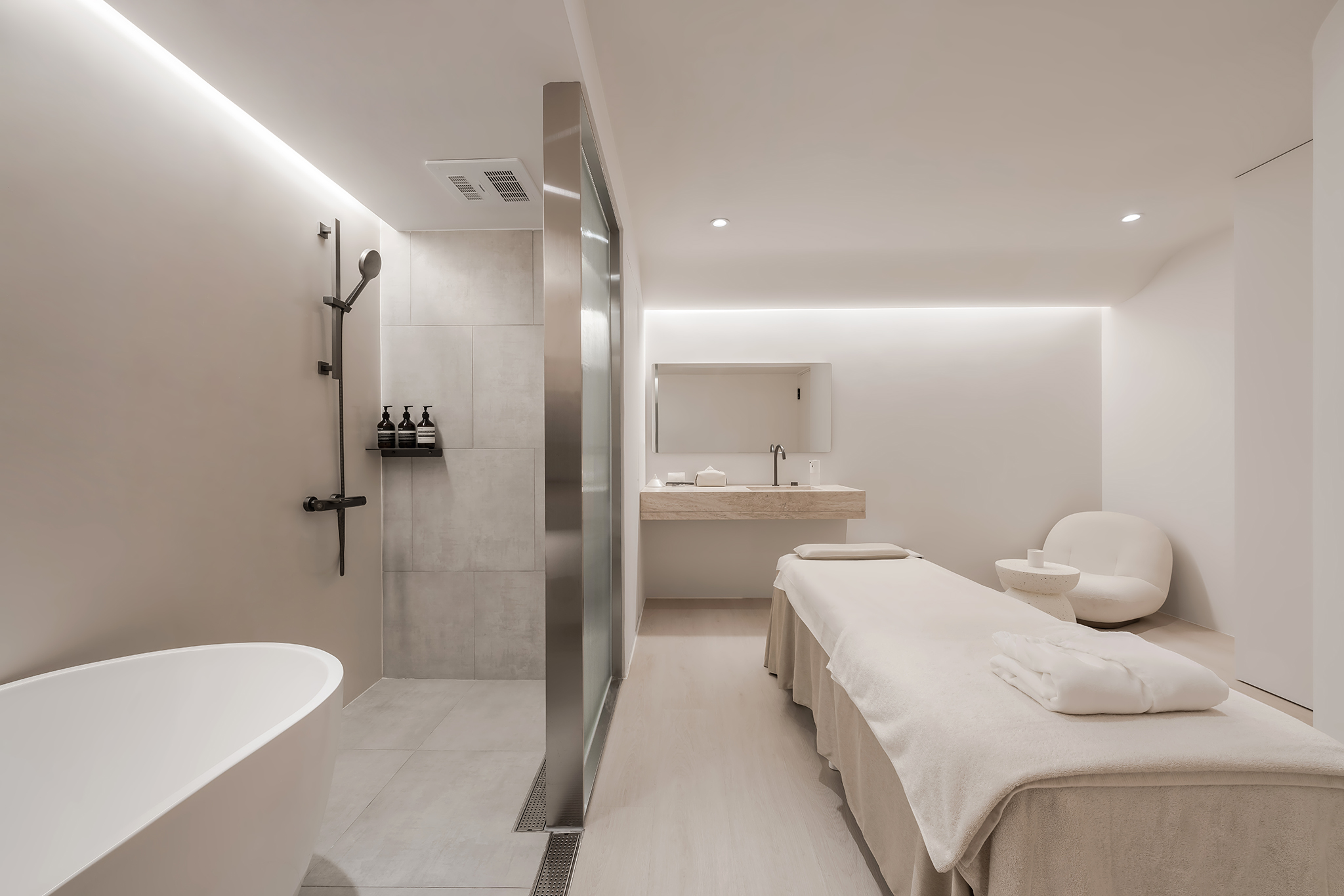 環境介紹 空間明亮與低彩的色調帶來質樸的侘寂之美檢測室、貴賓室、休憩區、VIP單/雙人房、獨立衛浴等空間設備搭配輕柔音樂,療癒香氛結合專業美療技術與親切服務讓顧客從裡到外享受沉浸式的五感體驗,深層釋放積累的壓力 讓身心靈回歸愉悅的平衡狀態。 櫃台&沙發區 迎賓大門 商品陳列區 換鞋區 提供不同尺碼 檢測室 貴賓室 休憩區 單人房 VIP雙人房 衛浴設備